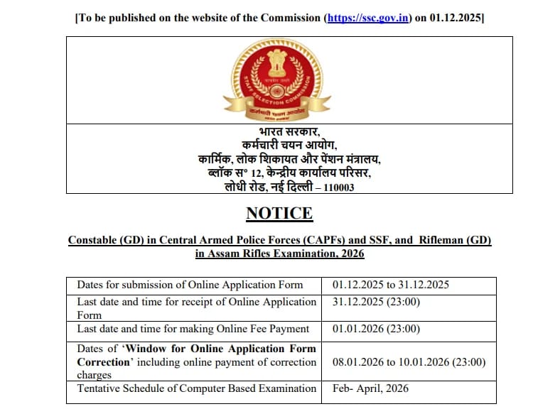 SSC Constable की तरफ से इस भर्ती की आधिकारिक अधिसूचना जल्द जारी होने की उम्मीद है, और इसी को ध्यान में रखते हुए यहां पूरी और आसान भाषा में पूरी जानकारी दी जा रही है, ताकि आप किसी भी चरण में गलती न करें।